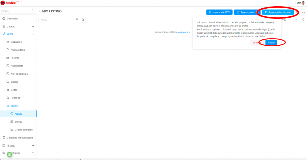 Cliccando poi su Aggiungi da categoria in alto a destra compare un pop-up con una breve istruzione, premere Avanti per procedere.