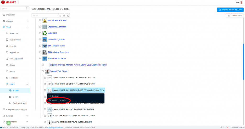 Navigando nell’albero delle categorie merceologiche è possibile individuare la categoria dell’articolo da inserire. Una volta individuata, cliccare su di essa e premere Aggiungi articolo.