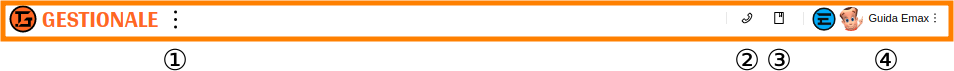 Topbar 18 Gennaio 202128 Dicembre 2020 di Nico Scian ① – Pannello software I tre puntini permettono di accedere agli altri prodotti EMAX alla quale la vostra azienda ha aderito senza dover uscire dal gestionale. ② – Contatti Lista dei contatti inseriti con i relativi ruoli e numeri di telefono. ③ – Guide Elenco delle guide del Gestionale EMAX ④ – Pannello utente/azienda Pannello dalla quale è possibile accedere al profilo dell’Utente, al profilo Aziendale oppure disconnettersi.