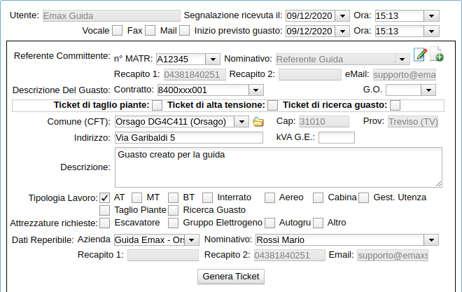 “Genera nuovo” consente di poter creare, nell’evenienza, un ticket di guasto manualmente: