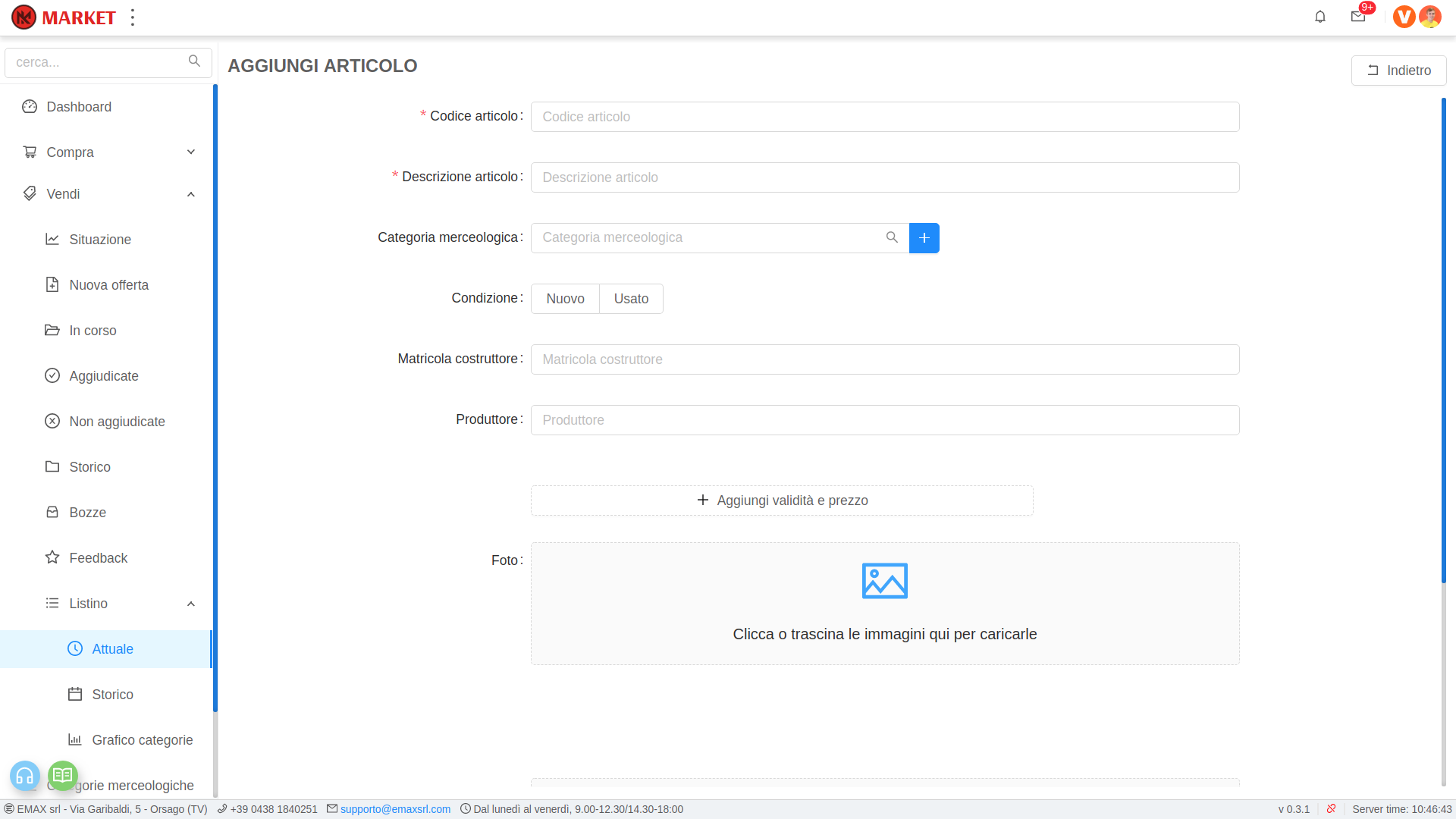 Per inserire gli articoli in Market è possibile aggiungerli singolarmente, oppure importarli da un file .CSV. Di seguito vi spieghiamo come inserire un singolo articolo.
