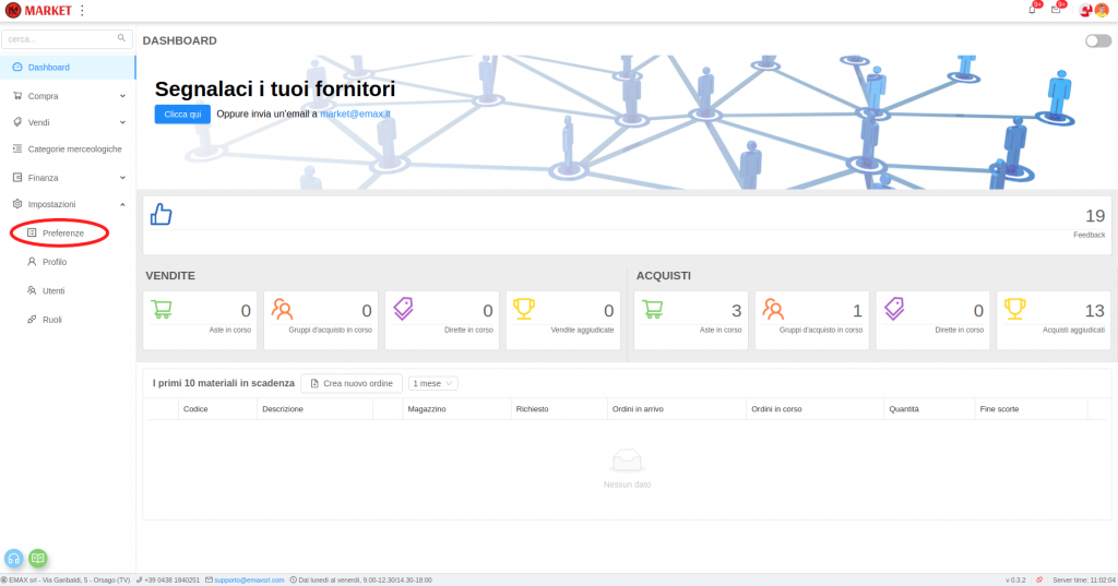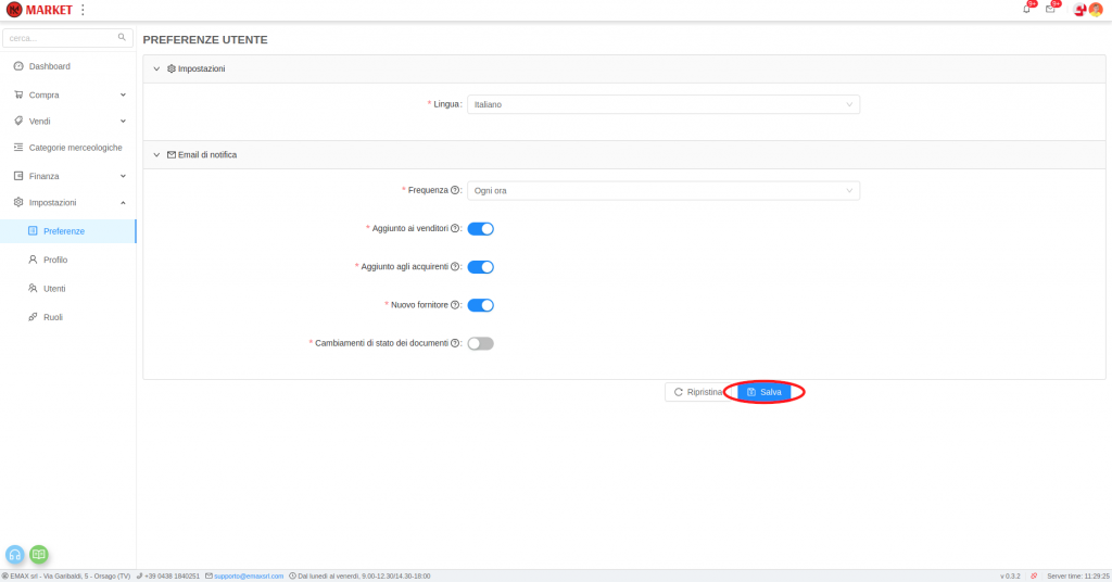 Modificare le preferenze 2 Luglio 20192 Luglio 2019 di Stefano Da Ros In Market è possibile modificare le preferenze del proprio utente all’interno della piattaforma. Per modificare le impostazioni dell’utente, aprire il menù Impostazioni e cliccare su Preferenze. Qui è possibile modificare le impostazioni dell’utente come lingua e quando ricevere le email di notifica.Una volta completate le preferenze cliccare il bottone ‘Salva‘ per salvarle.Cliccando su ‘Ripristina‘ verranno impostate le preferenze iniziali del sistema.