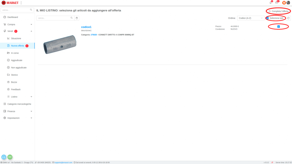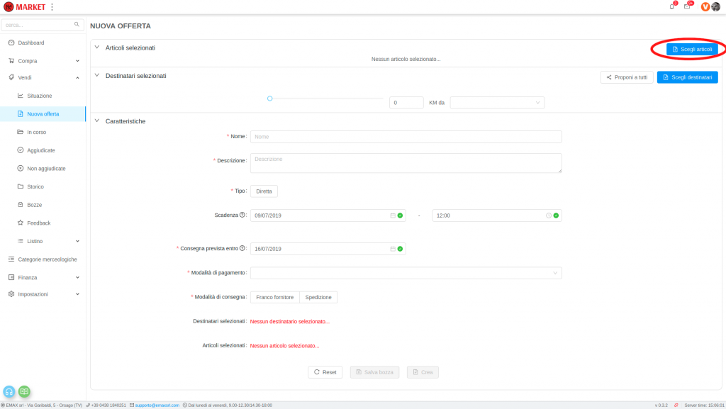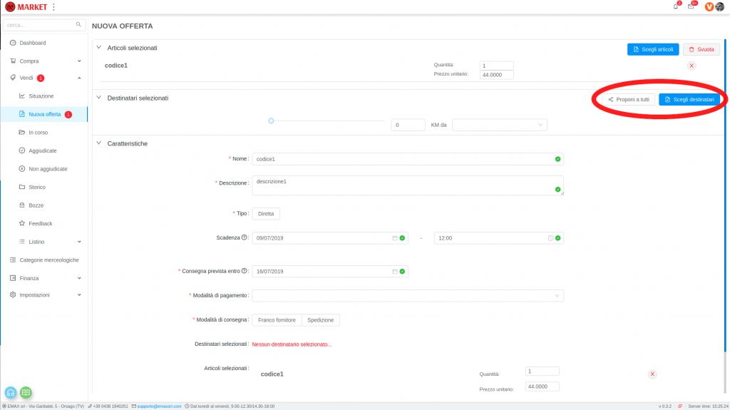 Per selezionare i destinatari è possibile mettere il comune e la distanza da esso e verrà segnalato quante saranno le aziende partecipanti, oppure selezionare le singole aziende cliccando il bottone ‘Scegli destinatari‘ o proporlo a tutti i compratori di Market con il tasto ‘Proponi a tutti‘.